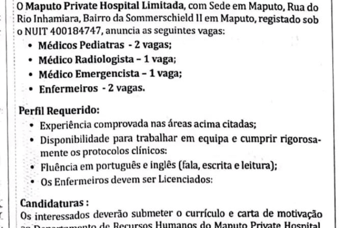 O Maputo Private Hospital acaba de abrir VAGAS EXCLUSIVAS para profissionais apaixonados pela saúde, comprometidos com excelência e desejosos de trabalhar num ambiente moderno, dinâmico e altamente reconhecido.